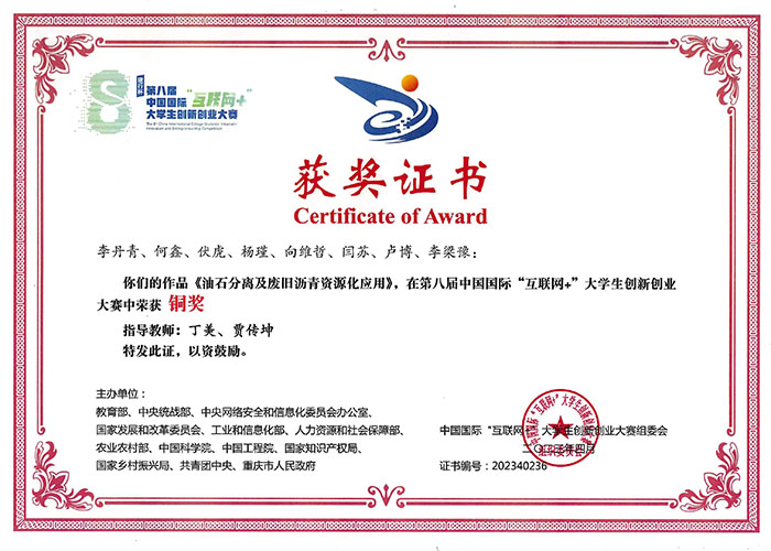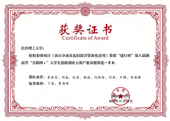 山东咏坤新材料科技有限公司以长沙理工大学贾传坤教授团队“废旧道路沥青油石分离方法”及“废旧沥青锂钠离子电池负极材料制备方法”2项发明专利为支撑,拟建设年处理10万吨/台油石分离设备生产线4条、年产4000吨沥青基电池负极材料生产线4条,开创了将废旧沥青变锂钠电池负极材料产业化的先河。